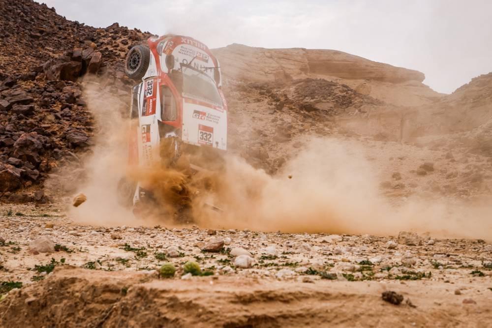 Na ciężarówkach najszybszy był Andriej Karginow przed Alaksiej Wiszniewski i Dmitrijem Sotnikowem. Ten ostatni utrzymał prowadzenie w generalce. Na drugim miejscu znalazł się jego kolega z KAMAZ-a Anton Szibałów, trzeci jest Czech Martin Macik Jr. Ciekawostką jest powrót do rywalizacji reprezentanta MAZ-a Siarhieja Wiazowicza. Białorusin po pechowej awarii na czwartym oesie wystartował naprawioną ciężarówką, ale nadal jest w trasie.